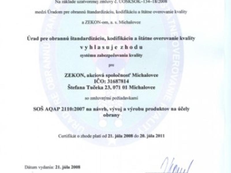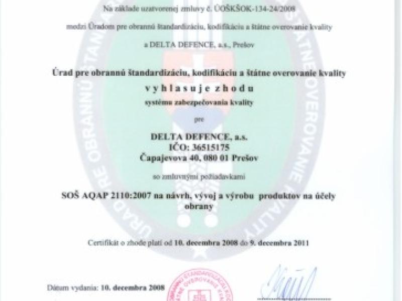 Dňa 18. decembra 2008 slávnostne odovzdal akciovej spoločnosti DELTA DEFENCE Prešov certifikát o zhode systému zabezpečovania…