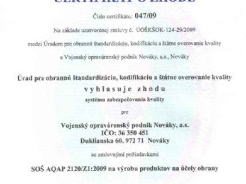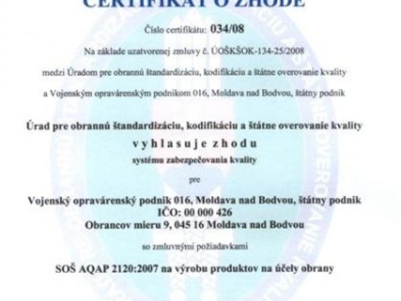 Dňa 10. marca 2009 slávnostne odovzdal VOP 016, š.p. Moldava nad Bodvou certifikát o zhode systému zabezpečovania kvality podľa SOŠ…