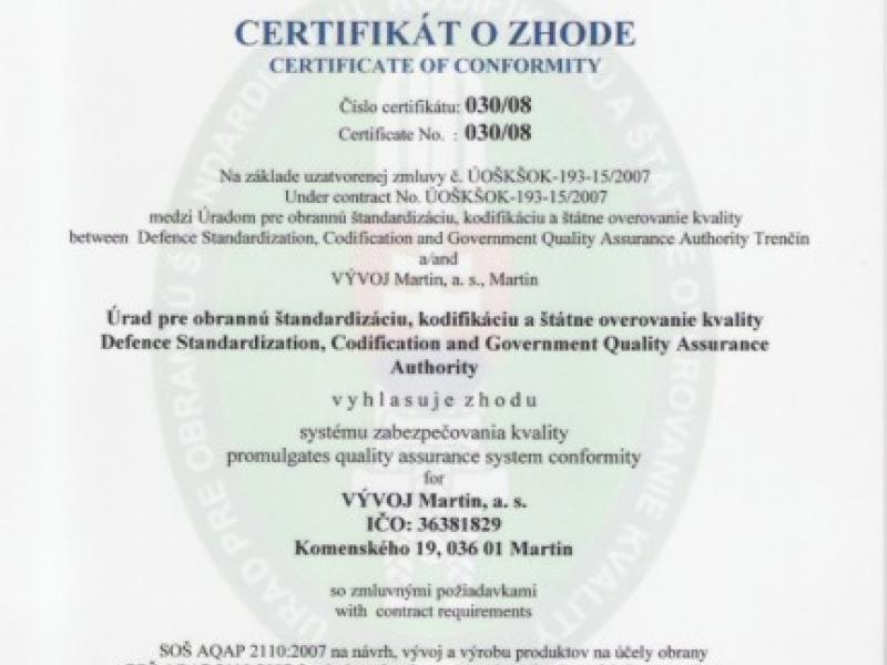 Dňa 20. októbra 2008 sa v akciovej spoločnosti VÝVOJ, a.s. Martin uskutočnilo slávnostné odovzdanie certifikátu o zhode…